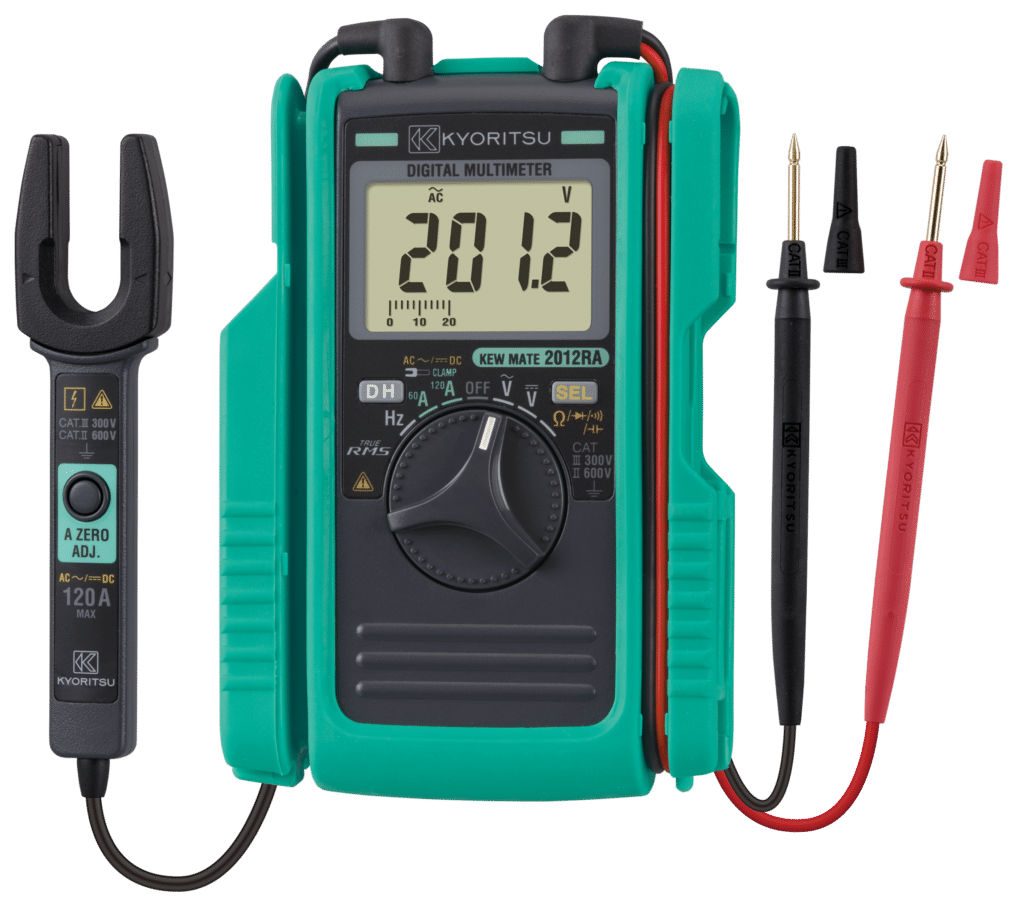 The KEW MATE 2012RA is a TRMS digital multimeter that measures both voltage and current.